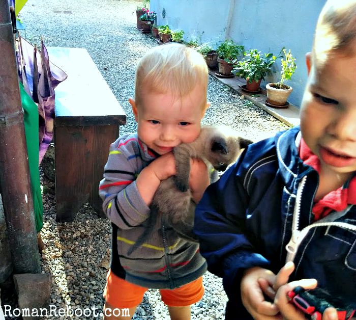 The boys enjoyed the playground and baskets of toys. Oh, and did I mention the KITTENS?? These three tiny balls of fluff were a highlight of the visit. Henry still requests to return to the “cat house.” I can’t blame him. I could have cuddled these guys all day. The boys did. Like I blinked and Mac is one-handing a kitten. I predicted this would all end poorly, but these are the most patient cats I’ve ever met. I think Mac only got one tentative swipe, and he definitely deserved it. (His “petting” looks like trying to unscrew the head off the poor cat.)