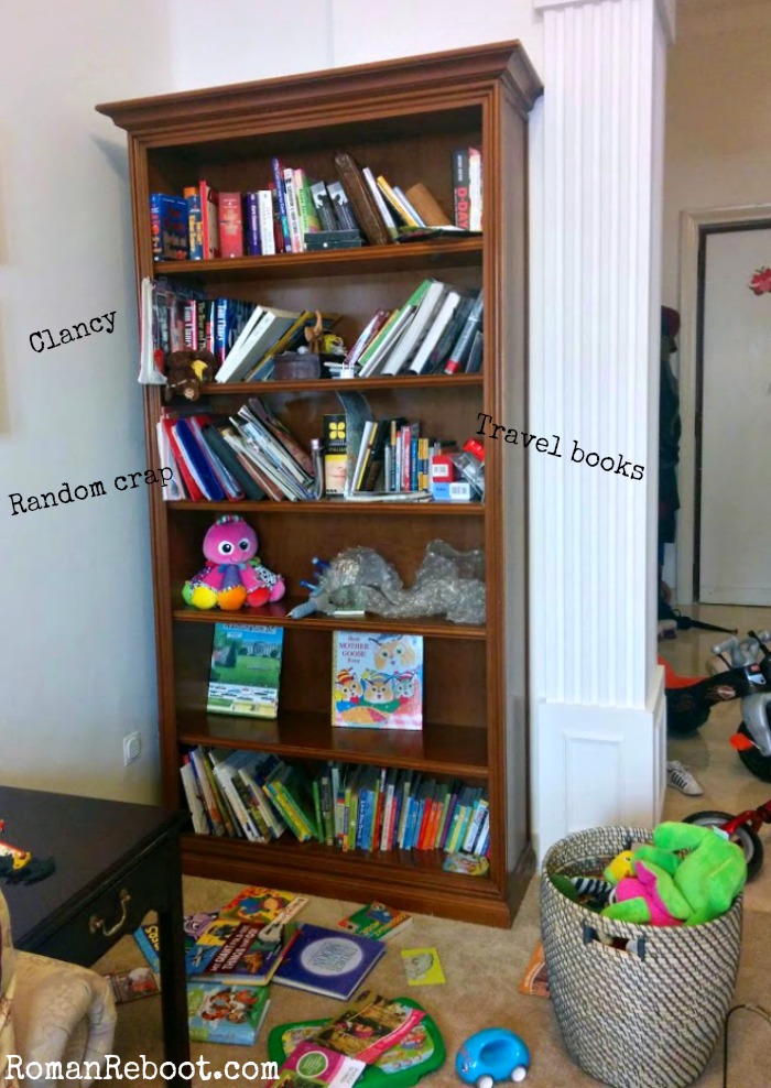 I also left the assorted papers that I STILL need to go through. And I couldn’t bear to de-group the travel books. They are generally all the same color anyway. (Which makes it super frustrating when you are trying to find a certain one around the house. Oh, is that Rome? NO. Grr, it is NOT your time Croatia.)