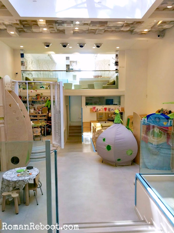 - They have a great space. Tucked away near Piazza del Popolo, you would never imagine the airy playroom inside. White, light wood, skylight.
