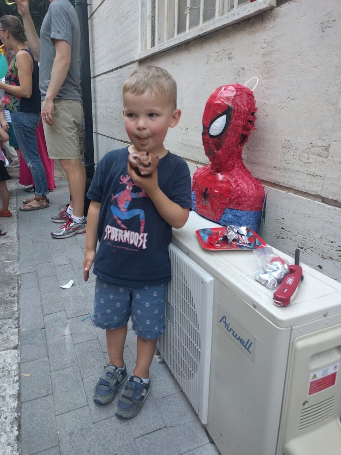 We did his party a week before his actual birthday because James would be traveling to Malta. (And we went too!) Just a cookout with friends. We did all things Spiderman. Thanks to the internets, we had Spiderman plates, masks, bubbles, and a pull string pinata. His party had a coloring station that I was proud of because we went to a local copy shop to get copies of a Spiderman pic to color. Henry was mostly just interested in running around with his friends. Mac was mostly just in it for the cupcakes.