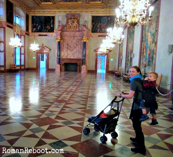 Henry lost it fairly early on during the tour. He vociferously refused to stay in the stroller. He wouldn’t walk. He was doing some screeching. We even tried putting Mac in the stroller with me wearing Henry as a backpack. You know what else is on the back of me? My hair. That doofus would not stop pulling my hair. We hustled through the beautiful rooms. In a way, it was probably better. This way I just enjoyed the palace ambiance without being worried about reading EVERYTHING. But it would have been nicer sans the hair pulling.