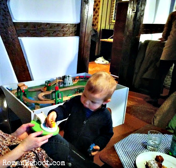 Eventually, we found the train table upstairs.  We stalked the squashy couch beside it and eventually had a great time unwinding after being out in the cold drizzle.  Henry was obsessed with the table.  It may have been his favorite thing of the entire trip.  This is why two year olds make crappy tourists.  I could show him the Sistine Chapel and he would probably be like oooo is that a light switch?  (Mac would probably be like LUNCH.  I remember in either first or second grade, the Sistine Chapel National Geographic one was super scandalous.  It was definitely passed around the room and whispered about.)